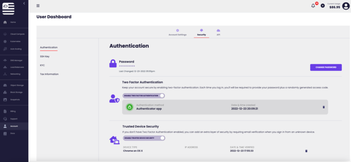 The main authentication settings including change password, two factor authentication, and trusted device security.