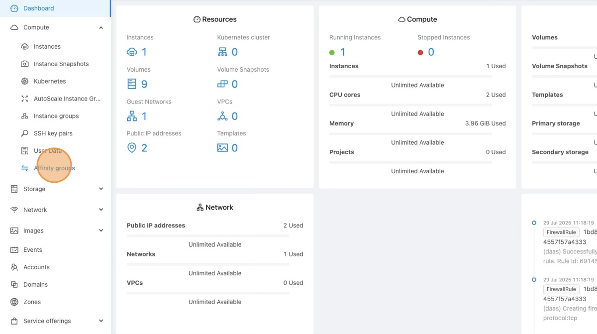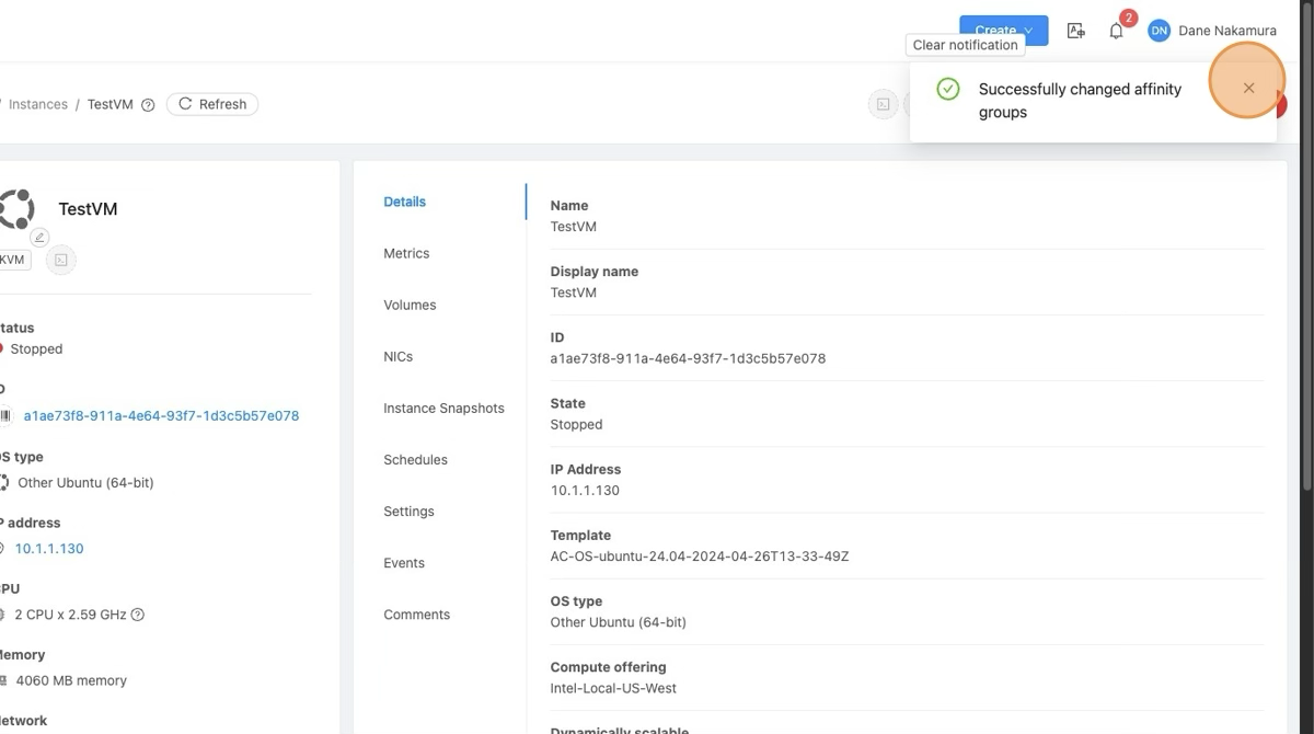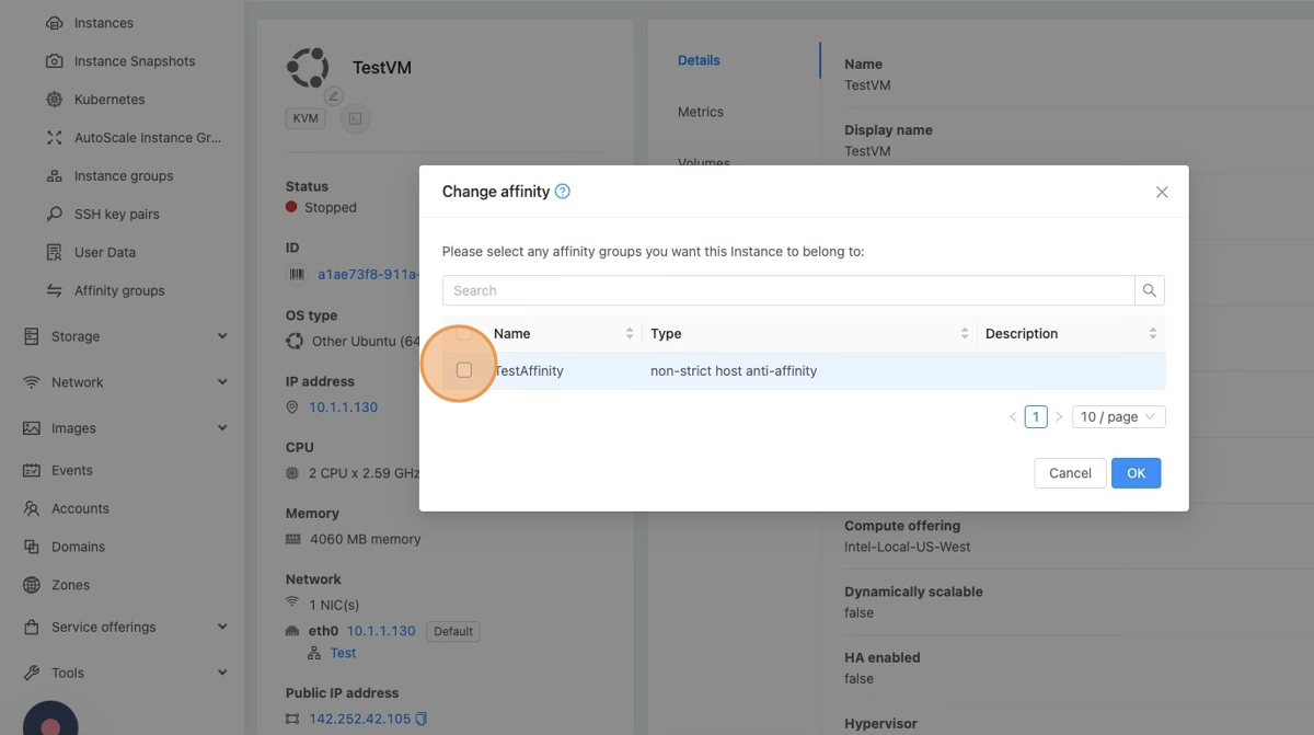 Tip! Affinity groups can be attached to instances while creating the instance. You can change an Affinity group of an existing instance from the Instance Details tab. Make sure to stop the instance before changing the Affinity group.