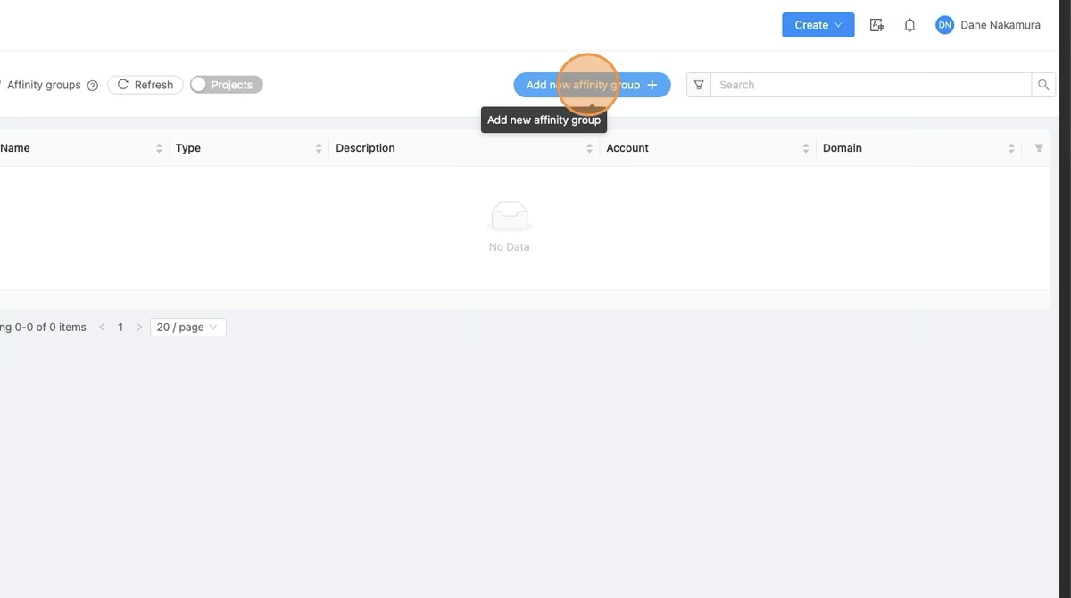 - From the left menu choose Compute > Affinity Groups, click Add new Affinity Group.