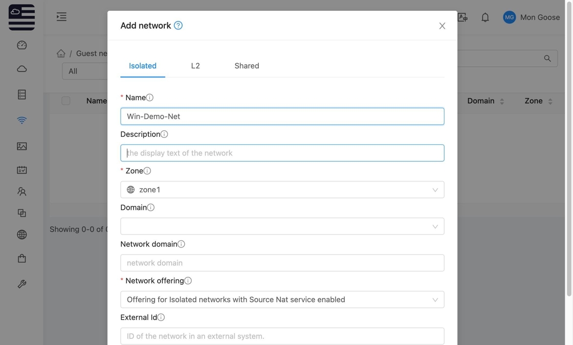 Network Offering: Select [[Offering for Isolated networks with Source Nat service enabled]].