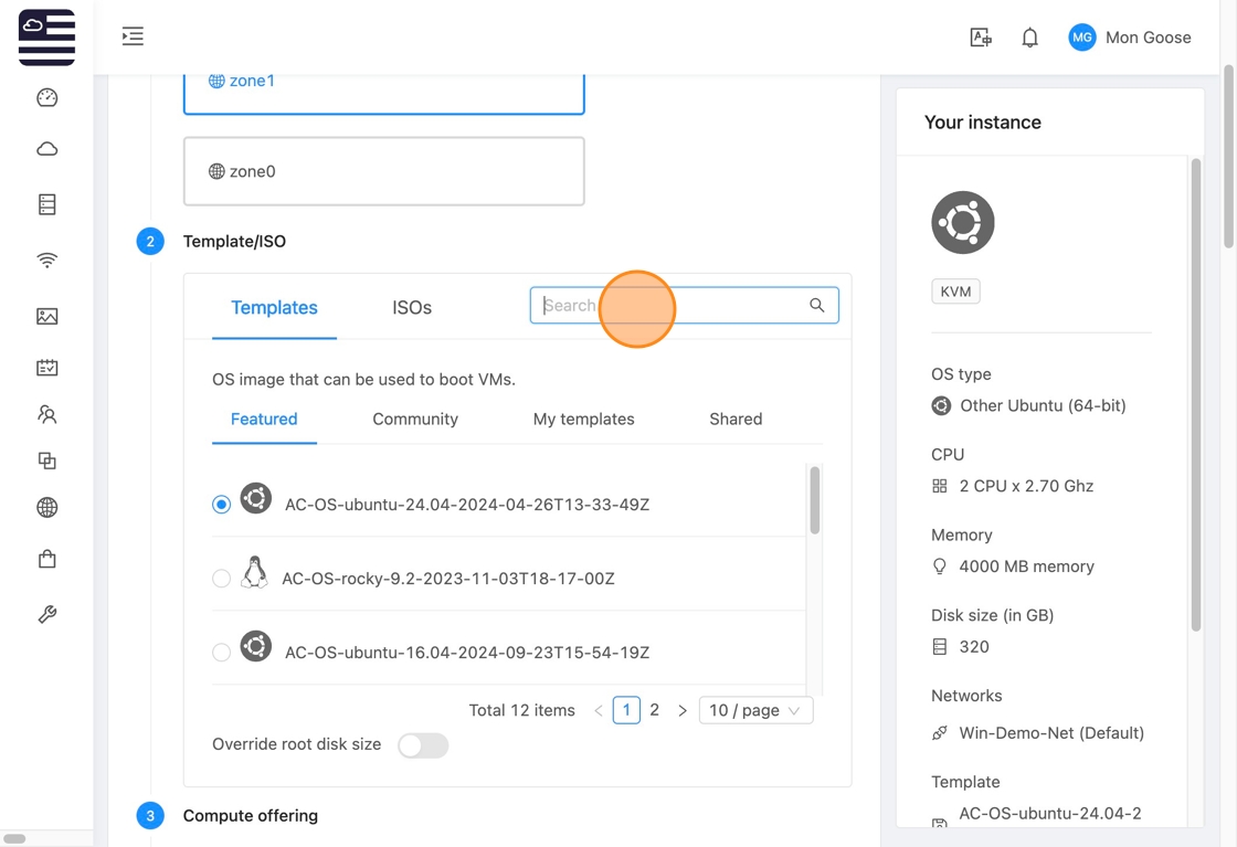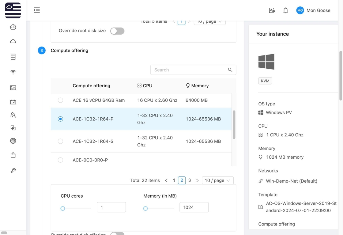 Select the appropriate offering. The ones listed above are custom offerings, allowing you to provision the vm more to your needs. We also have several default offerings.