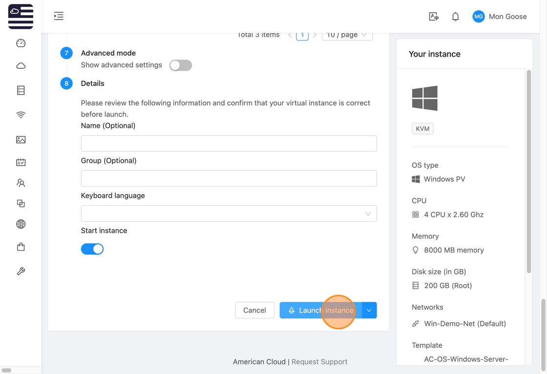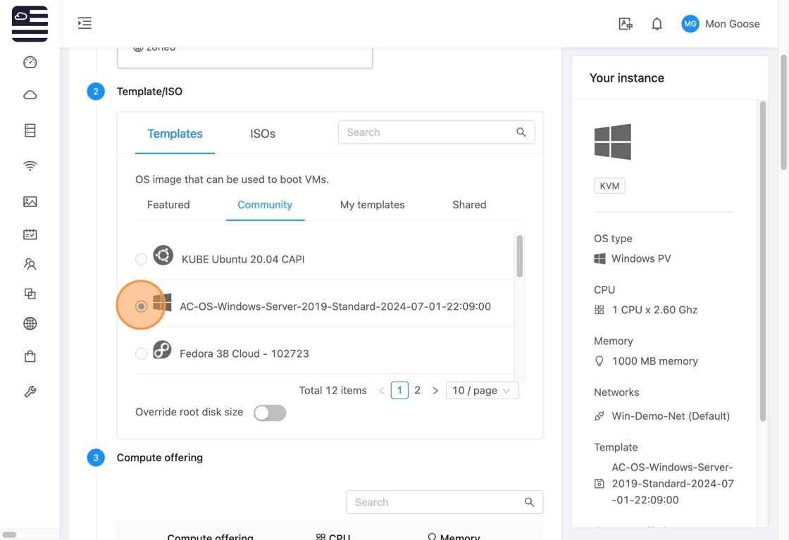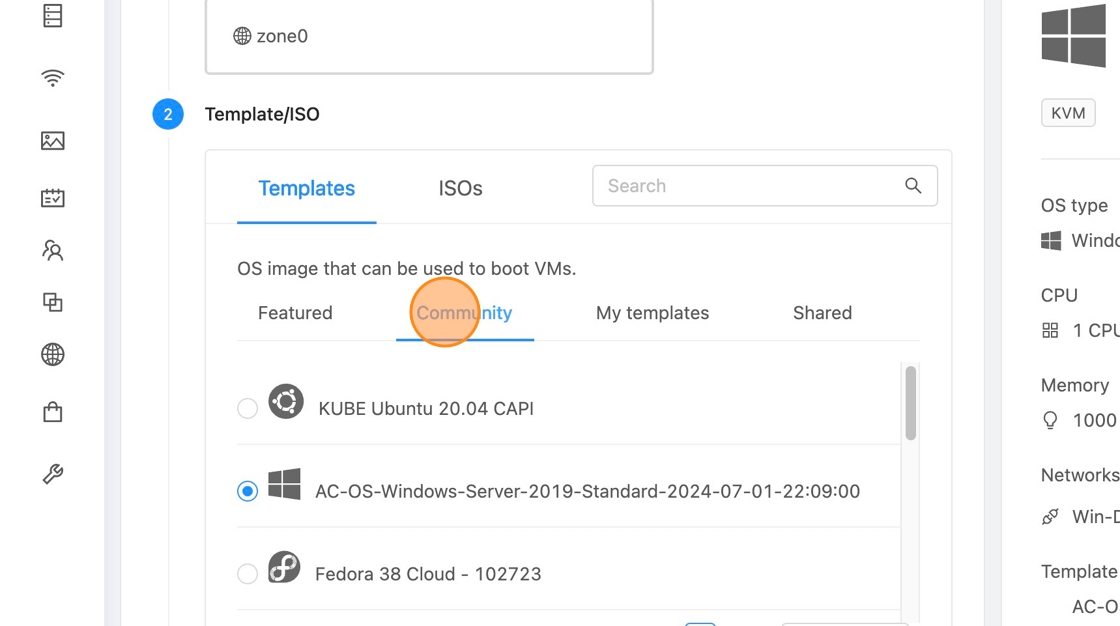 - Click [[AC-OS-Windows-Server-2019-Standar-2024-07-01]] is the newest template of windows. Select it by the radio button to the left.