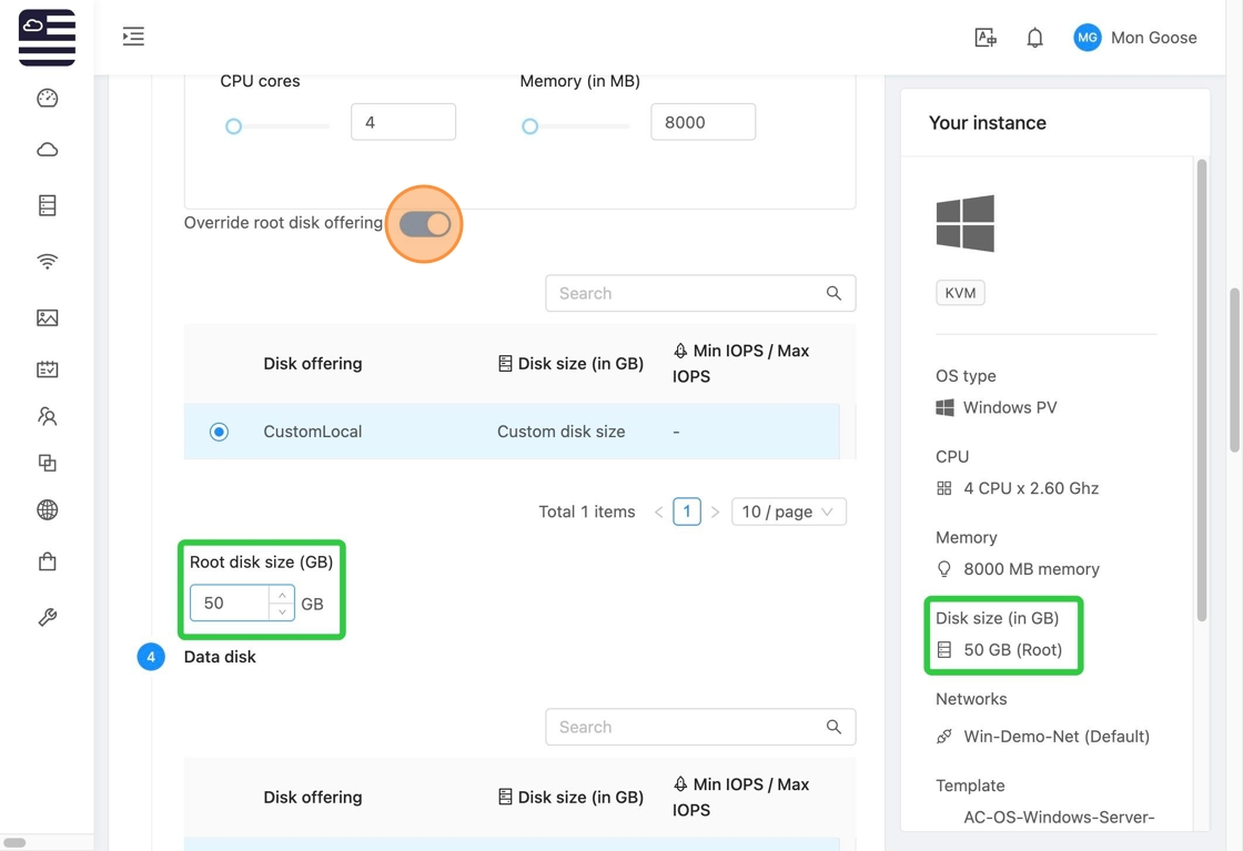 - Once CPU/RAM have been selected. You'll want to decide upon the size of the root disk. While looking at the VM build in the right-hand pane. You can identify the default disk offering of 50 GB. If your project requires more of a root disk. Select [[Override root disk offering]] toggle. In the disk offerings section select [[CustomLocal]]. Then scale the root disk to the appropriate size.