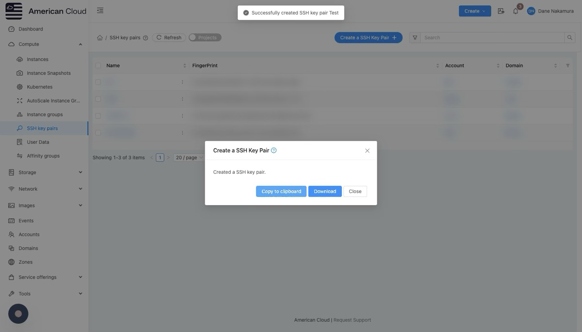 - Create a new keypair: ACE will generate a keypair and give you the private key.