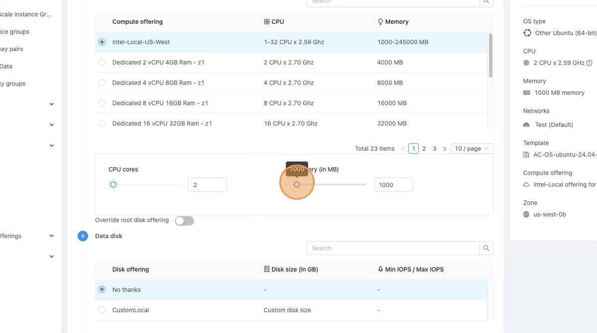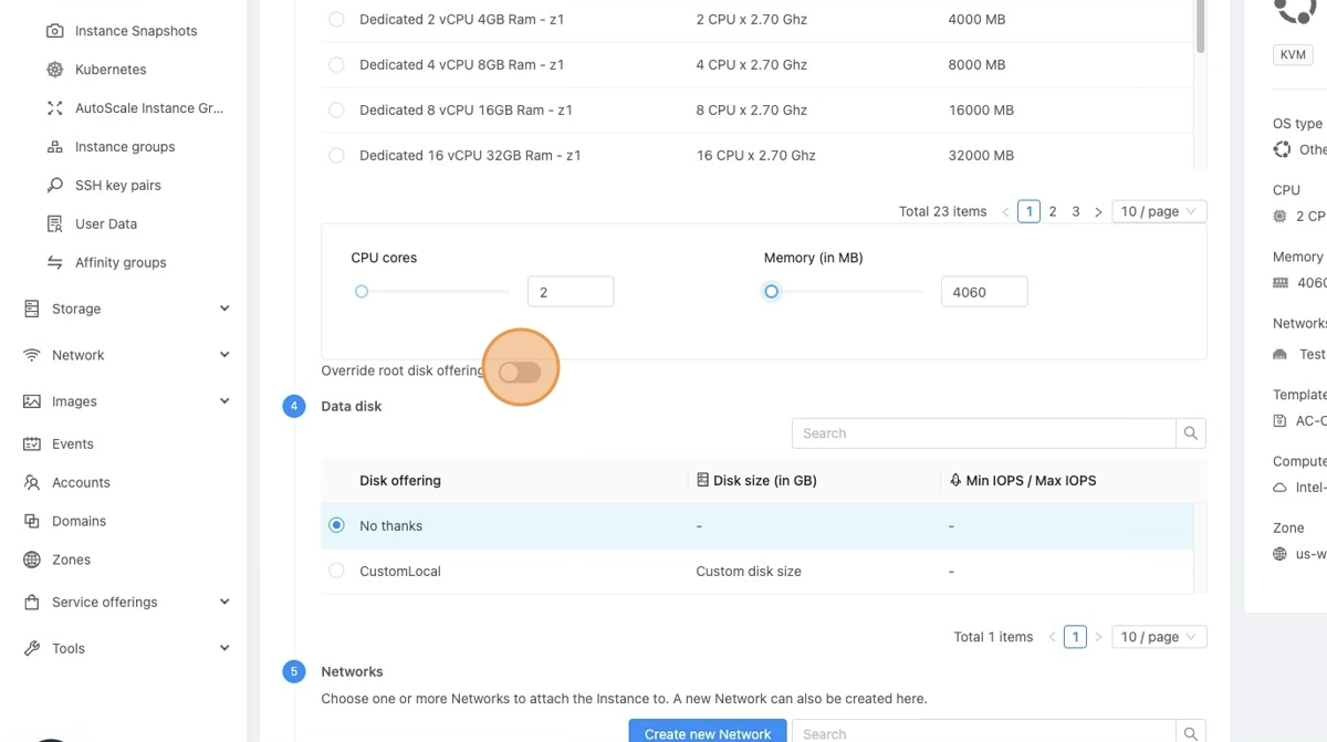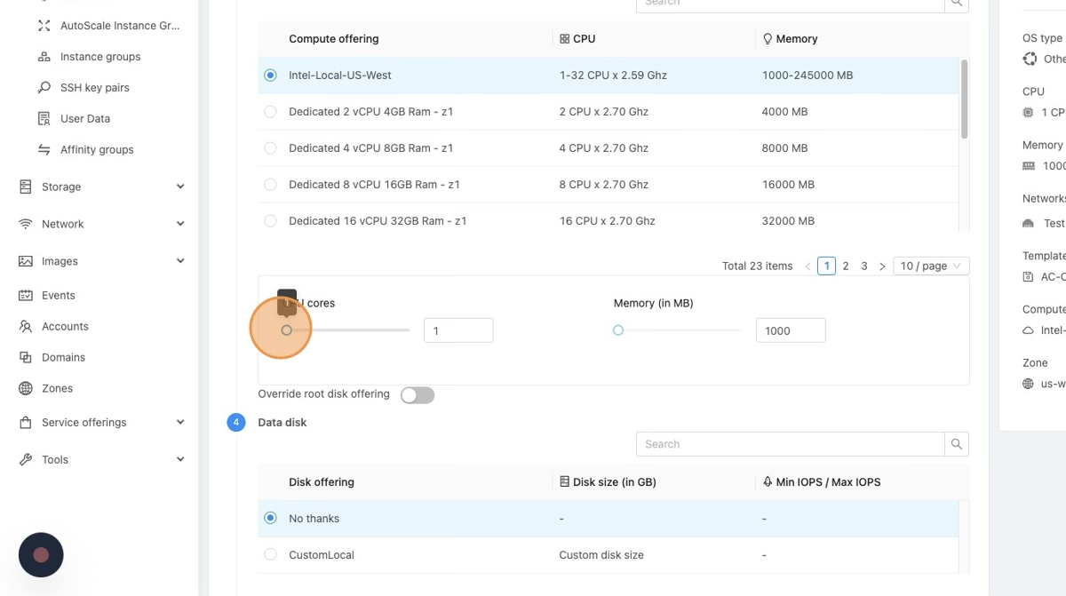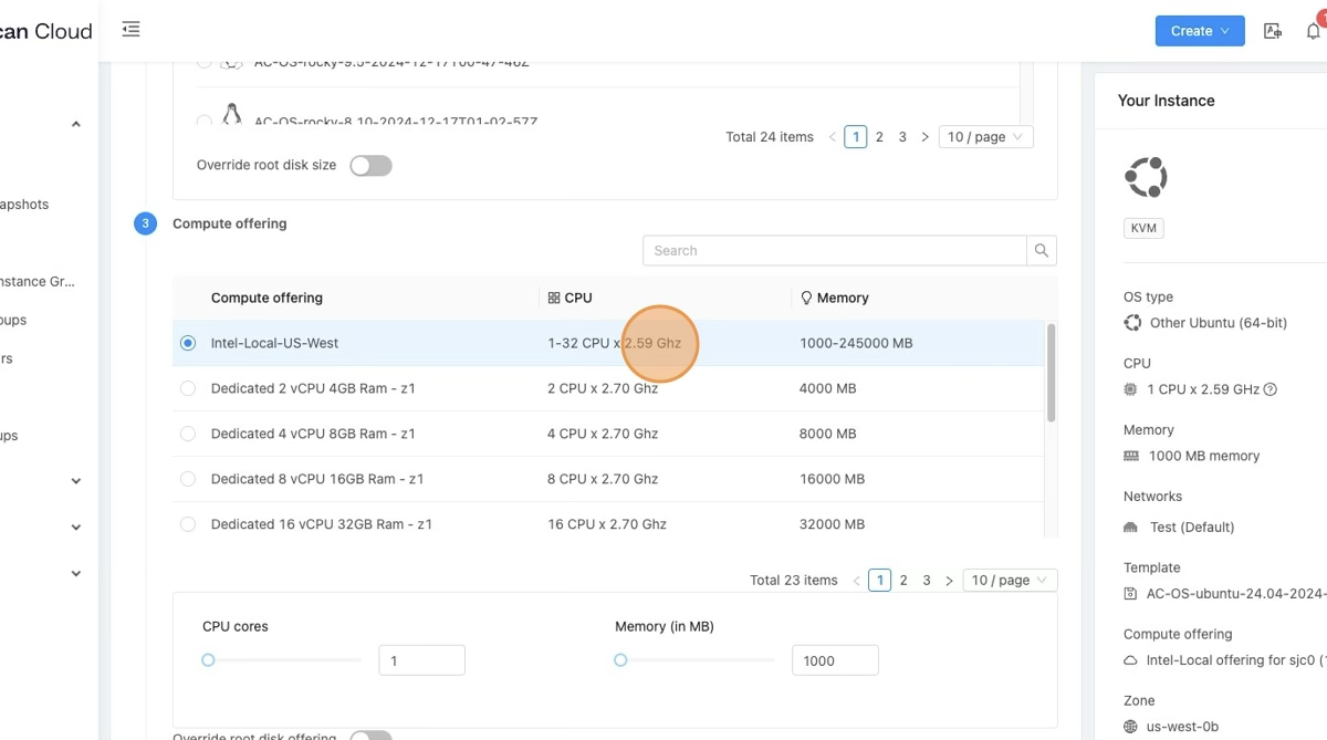 Select a Compute Offering for your Instance, which determines how many CPU cores and memory is allocated to the server or Create a custom offering.