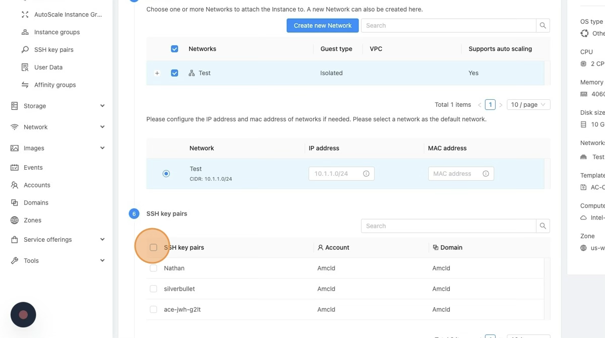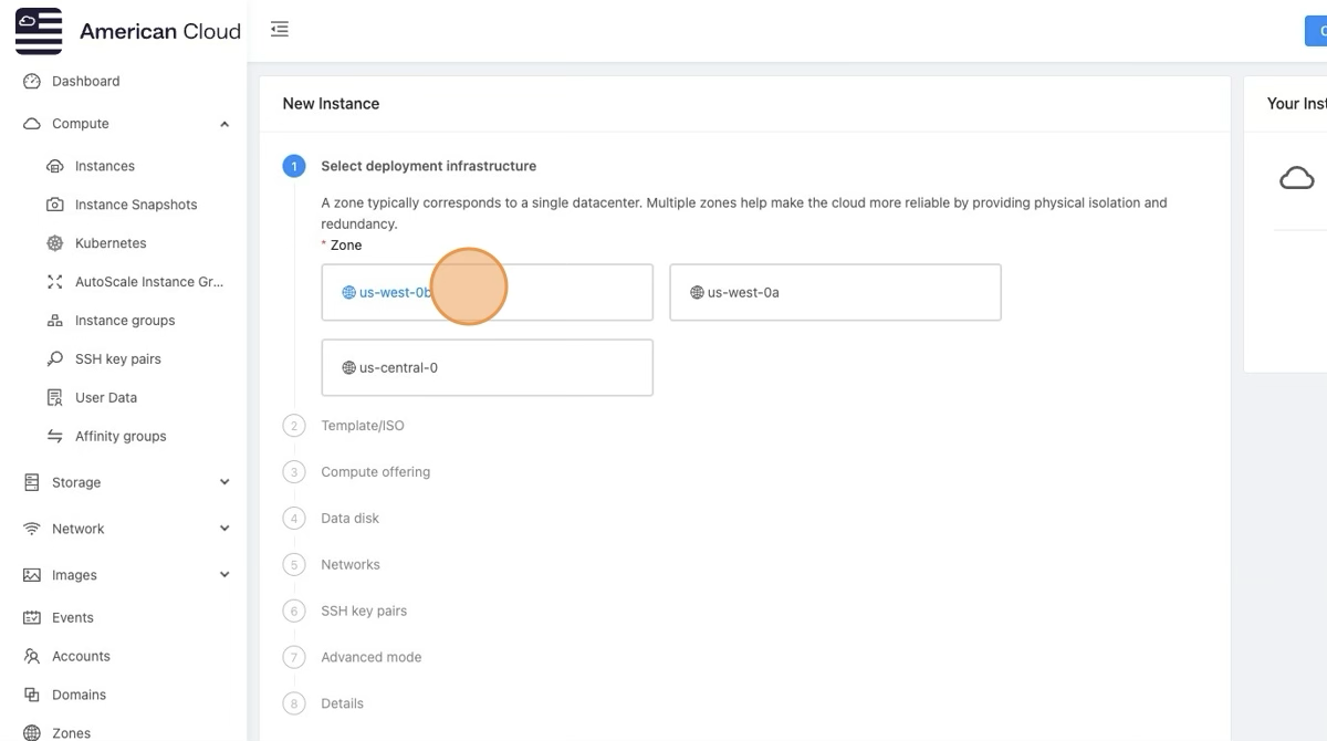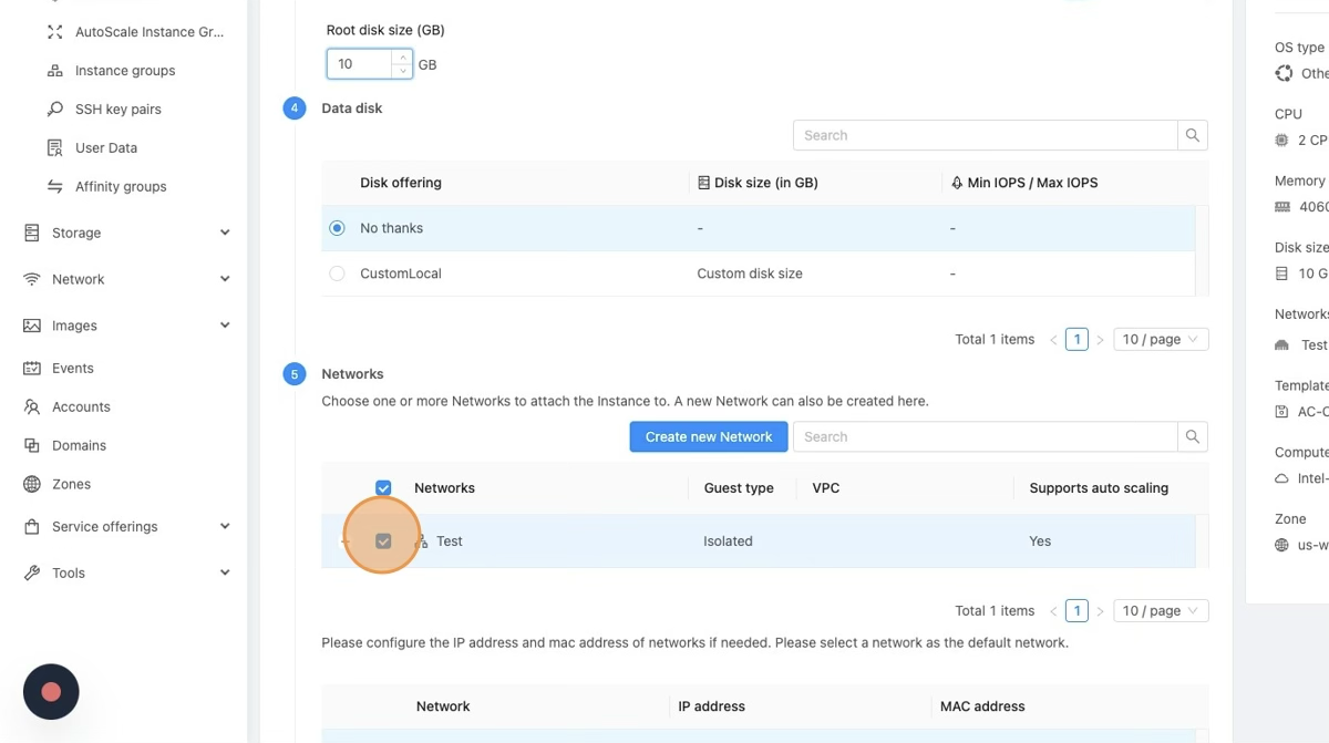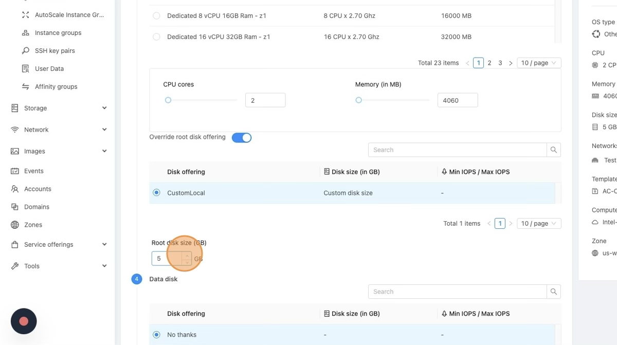 Select a Compute Offering for your Instance, which determines how many CPU cores and memory is allocated to the server or Create a custom offering.