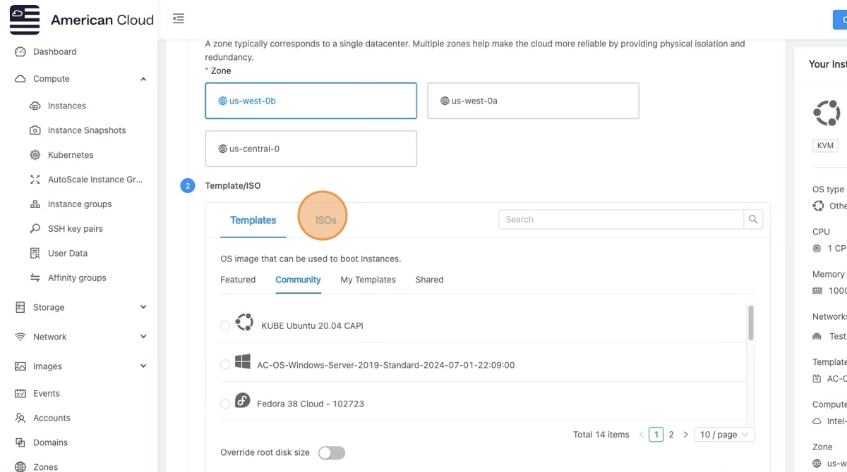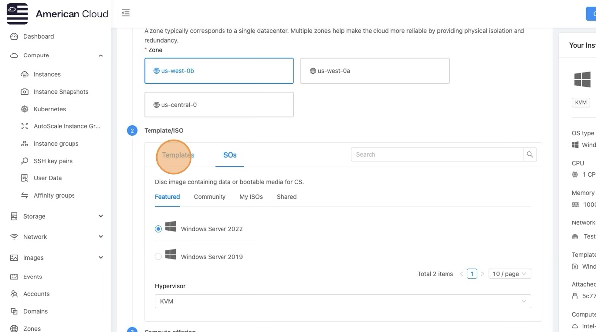 Choose a Template or ISO. *Templates are images containing an OS used to boot up the server, or boot from an ISO a virtual DVD/ CD that can be uploaded separately. Too see a list of all of our templates *Click Here.