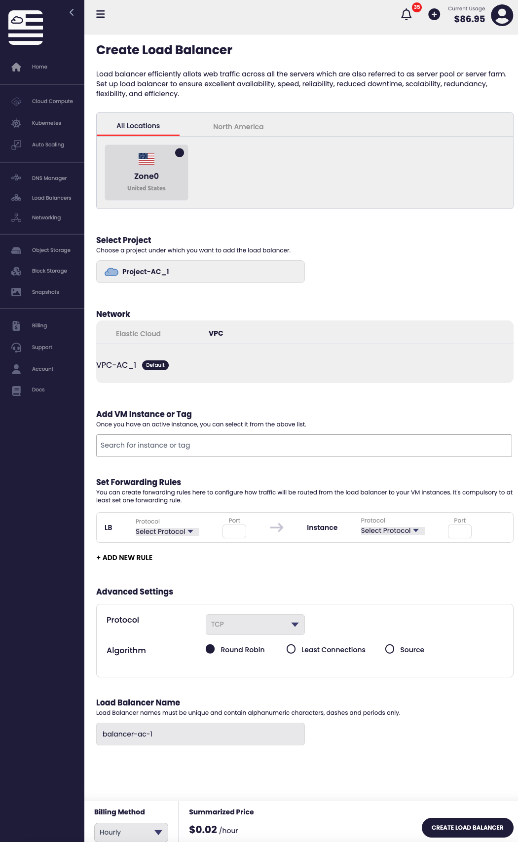 - Log in to the Web Portal, select Networking, and click Create Load Balancer.