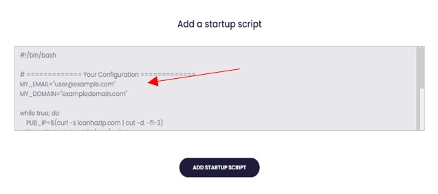 Verify that the values for {Your Email} and {Your Domain} are correctly entered in the Add New Startup Script configuration.