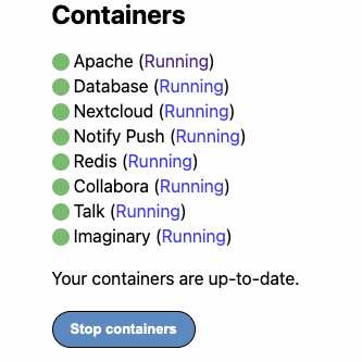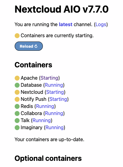 - If containers fail to start following nextcloud launch use the reload option.