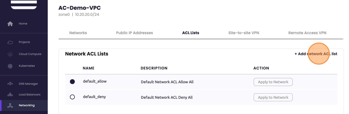 - Choose '+Add network ACL list'.