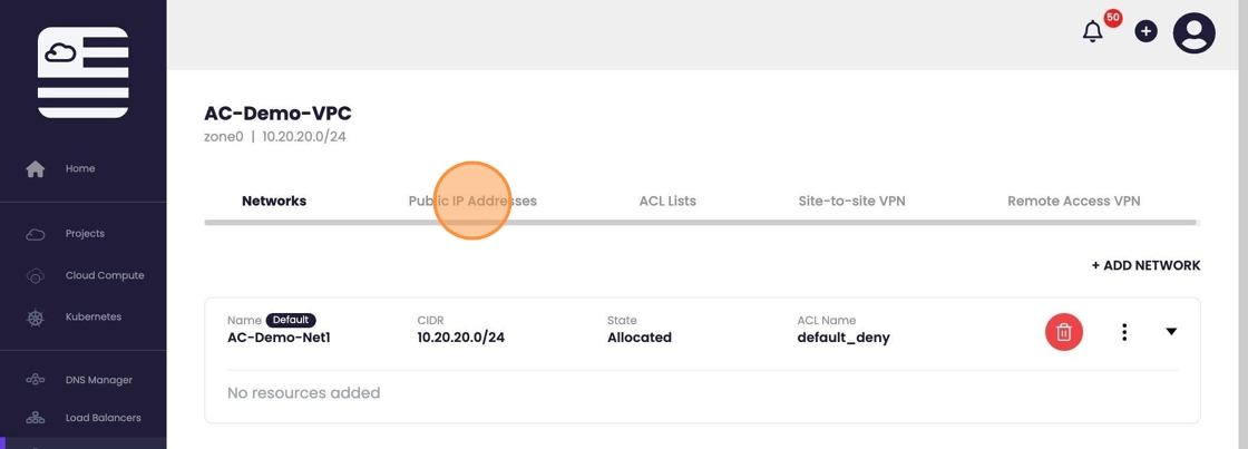 - Once the VPC is created we must add an internal network to being building our environment. Select "+ ADD NETWORK".