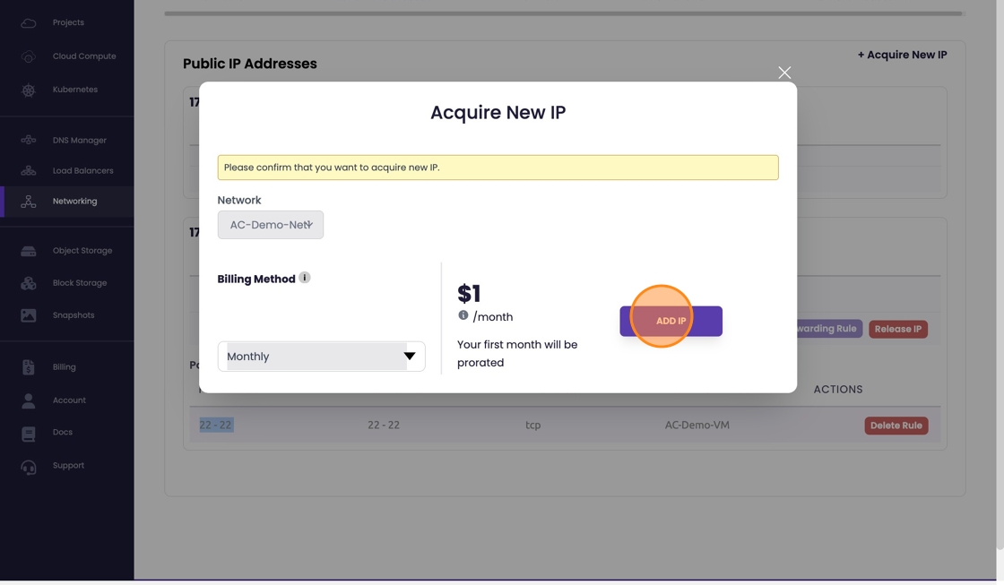 - Select the Network to add the ip to. A additional ip will cost $1 a month. Select "Add IP"