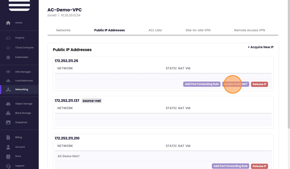 - The newly acquired ip will be listed in the ip table. To enable the ip as a static nat for a VM select "Enable Static NAT".