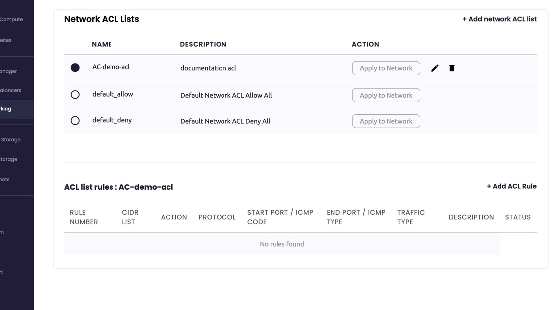 - Once the ACL is created we can add rules by selecting "+ Add ACL Rule".