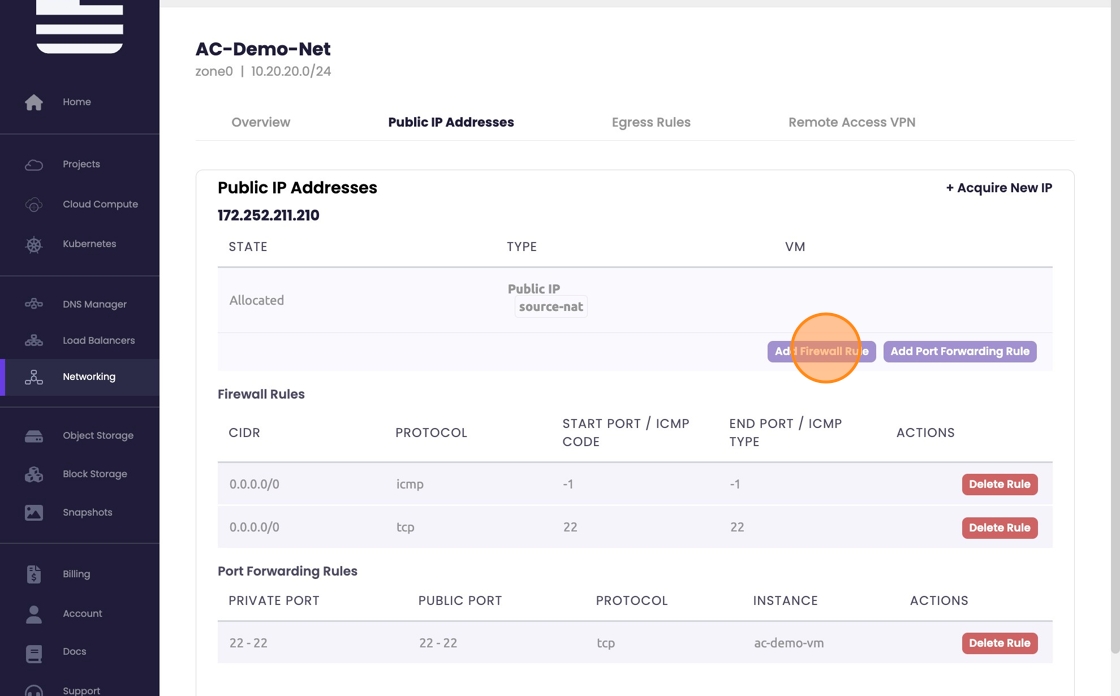 American Cloud allows self assigned firewall and port forwarding rules. During initial instance launch a few firewall rules will be established as default. These default rules are in place to ensure SSH and CMP graph are operational. To view and create firewall rules follow the following guidelines.