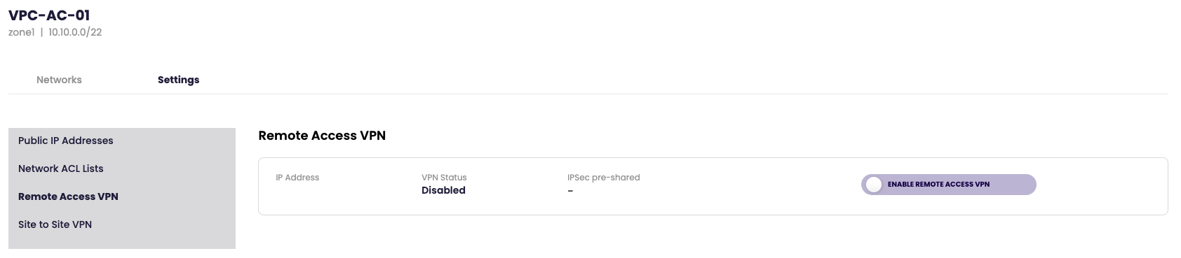 - Under the VPC select the Settings tab and click Remote Access VPN.