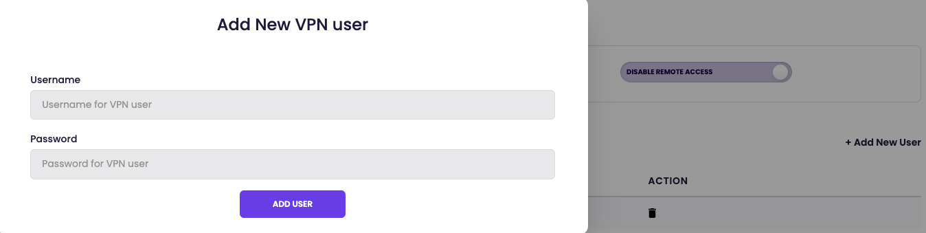 - Click on + Add New User and on New VPN User popup create username and password.
