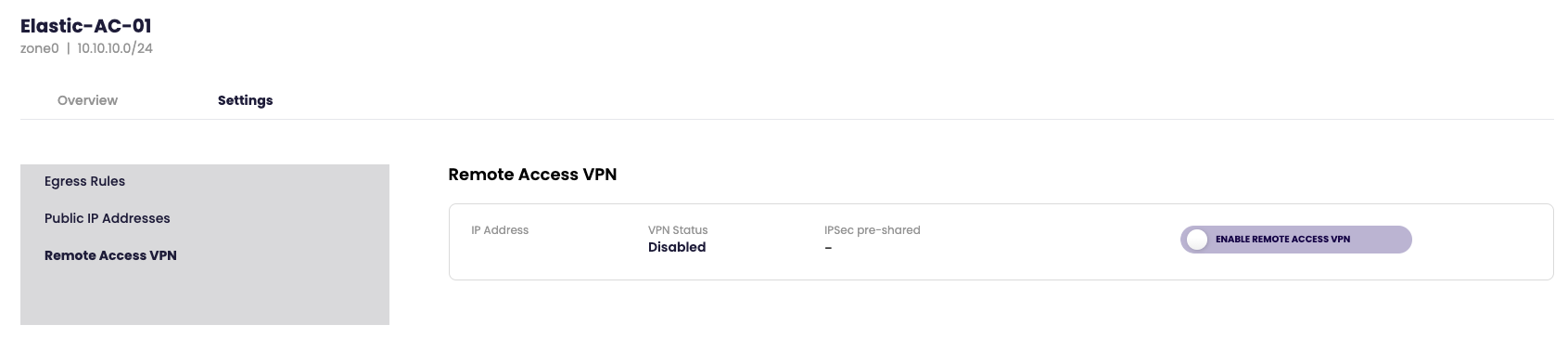 - Under the Elastic Network select the Settings tab and click Remote Access VPN.