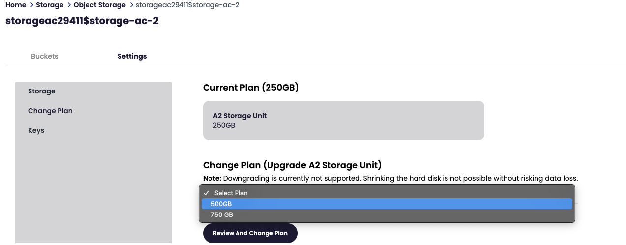 - In 'A2 Storage Unit' select the desired Object Storage to manage