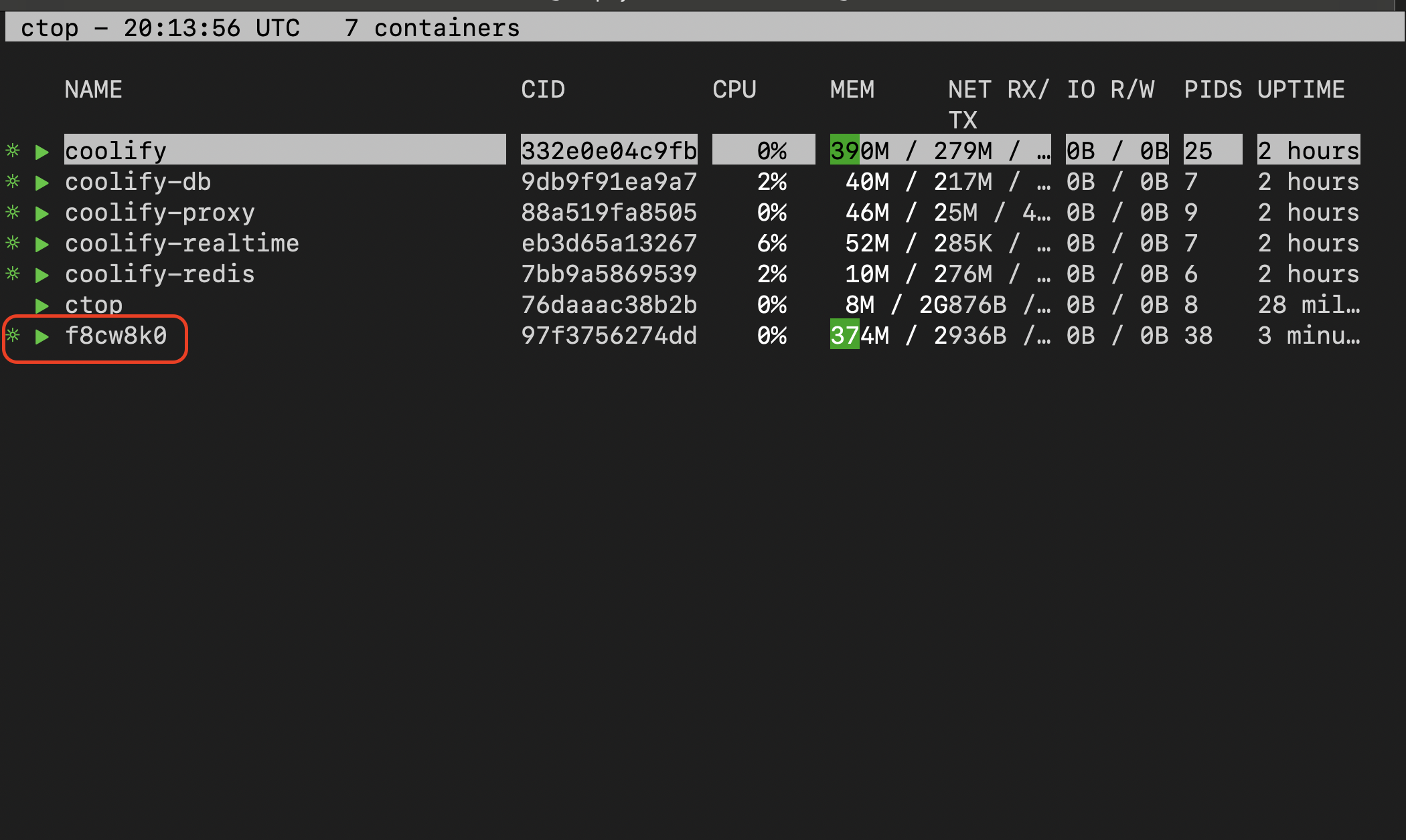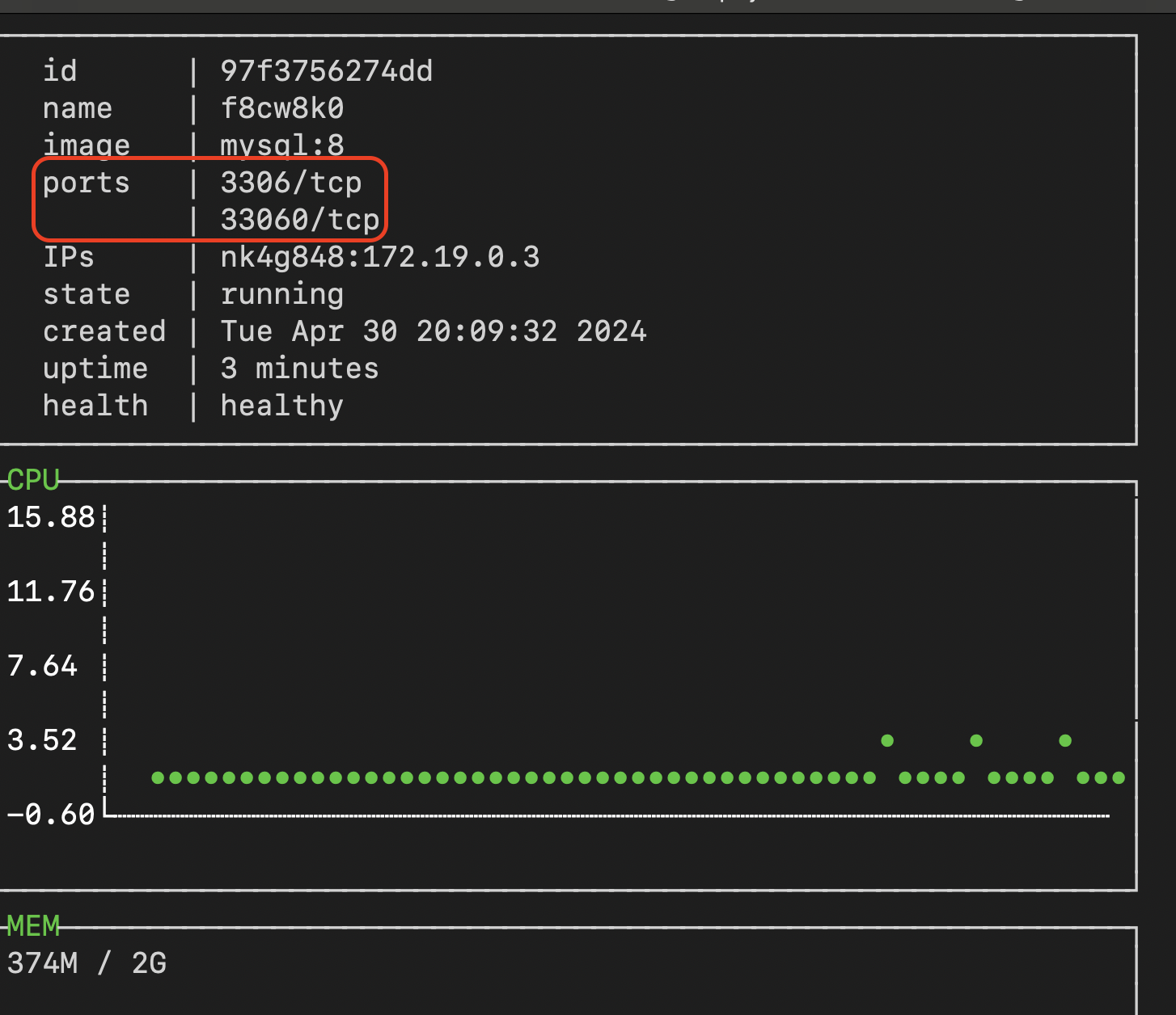 sudo docker run --rm -ti --name=ctop -v /var/run/docker.sock:/var/run/docker.sock quay.io/vektorlab/ctop:latest. This will list containers running on the machine. Using the arrow keys scroll to the MySQL resource and press enter.