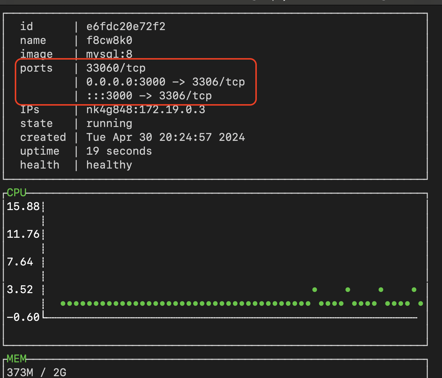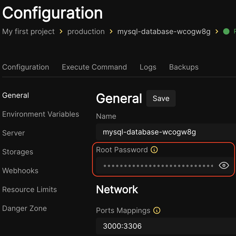 - Once restared, check the container to ensure ports are configured appropriately by repeating steps 6&7 above. As an example (below), port 3000 is mapped from the local coolify instance to port 3306 if the mysql container.