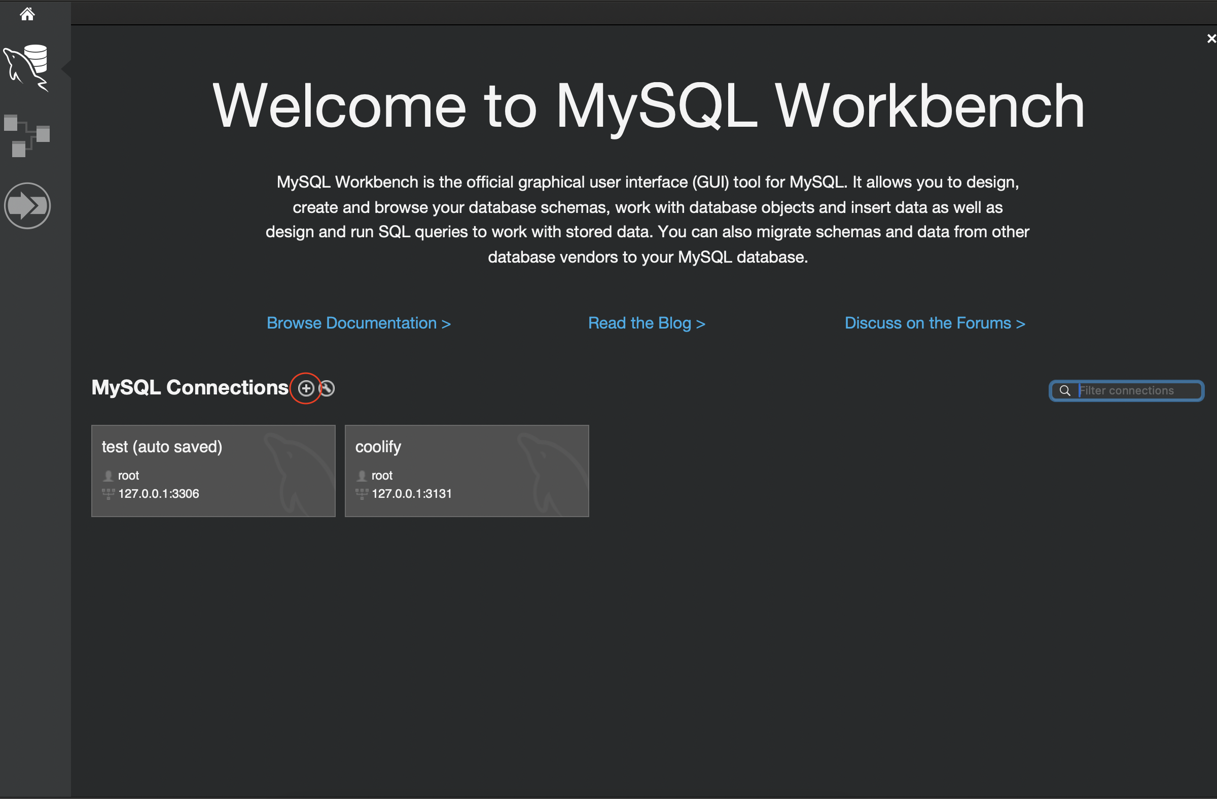 - Open MySQL Workbench and select '+' toggle to add a new connection.