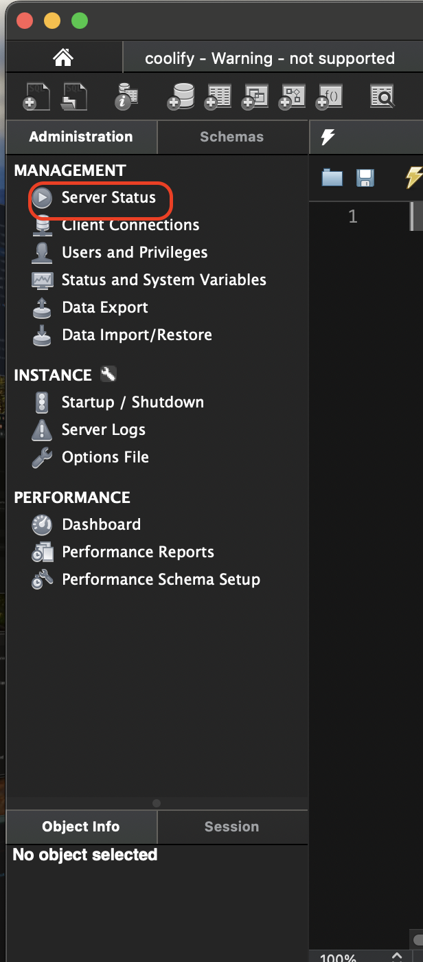 - Provide the MySQL root password from coolify in the MySQL Workbench pop up. Optionally, save the password to keychain for quick launch.