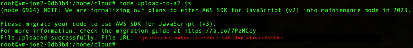 Once Node.js is installed and configured and the A2 storage is setup. This command can be used to run the script node upload-to-a2.js