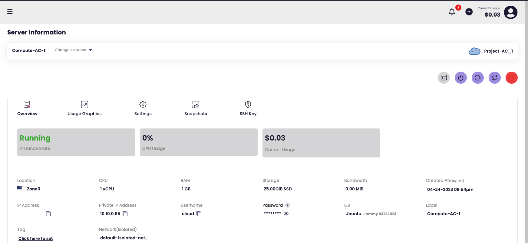 - Inside the 'Server Information' page retreive the public IP address, username (default cloud), and copy the password (default is a randomly selected password)